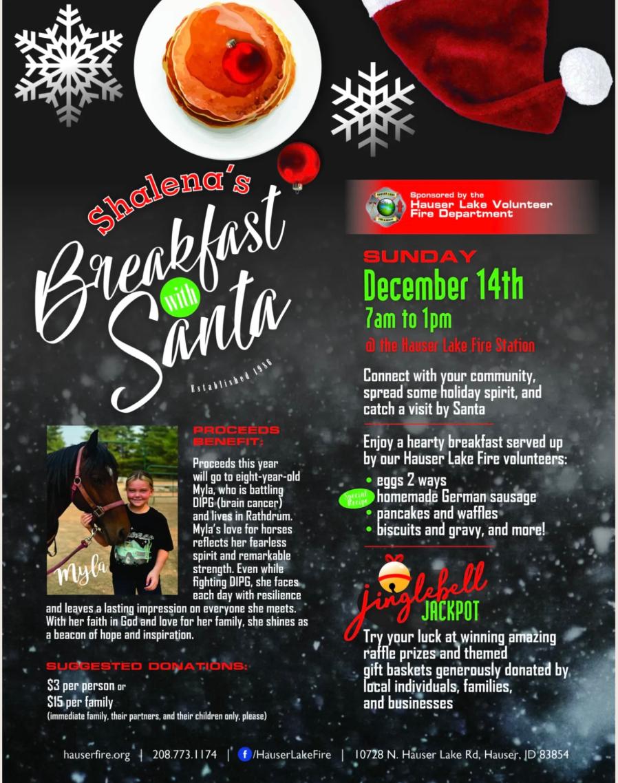 Breakfast with Santa at the Hauser Fire Department is on Sunday, December 14, 7am to 1pm. Scroll down for the details about this amazing benefit.